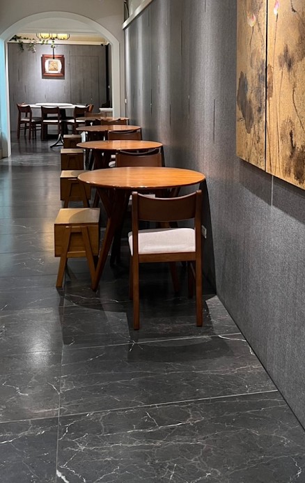 📍深色大理石紋磁磚在高人流空間具備耐髒、不顯汙、好清潔等優點,能維持餐廳空間整潔與質感。